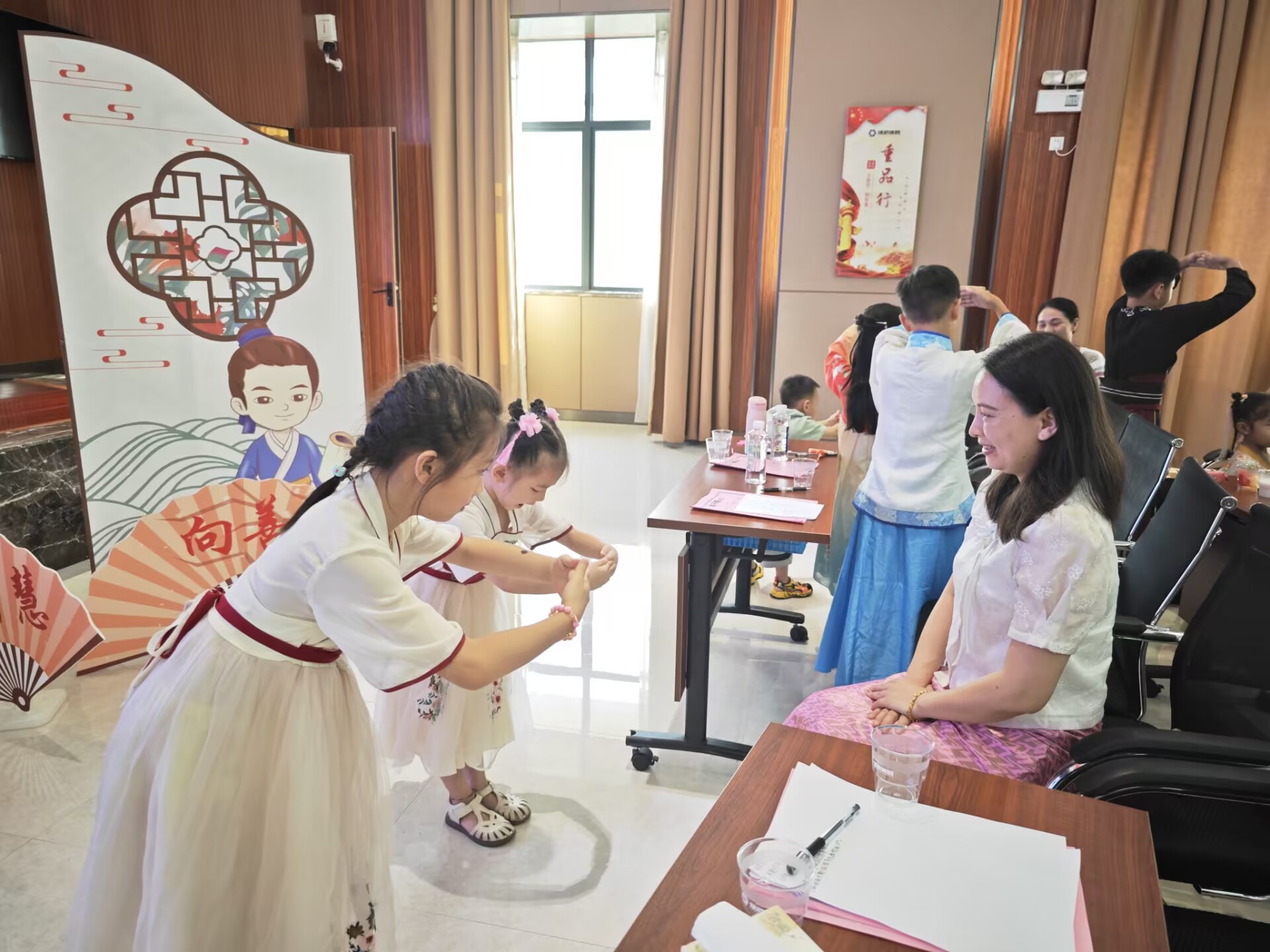活動以傳統(tǒng)禮儀的學(xué)習(xí)和體驗為主題,此次培訓(xùn)邀請了廣西經(jīng)貿(mào)職業(yè)技術(shù)學(xué)院智慧商務(wù)產(chǎn)業(yè)學(xué)院的老師韋斯斯講授少兒禮儀知識。活動中,韋老師向孩子們講解了《弟子規(guī)》中學(xué)習(xí)的重要、做人的道理以及待人接物的禮貌常識,讓大家更好地理解傳統(tǒng)的禮儀。韋老師親身示范,教授大家如何正確行認(rèn)知禮儀、家庭禮儀、餐桌禮儀、待客禮儀、交往禮儀、入泮禮、作揖禮、孝道禮儀等,在抬手躬身中感受禮儀之邦的古韻,學(xué)習(xí)尊師重教的品德。韋老師結(jié)合理論知識學(xué)習(xí),邀請孩子們上臺實操演練,模擬情景表演、開展親子互動小游戲等,孩子們紛紛上臺,為大家展示,將學(xué)到的文明禮儀知識落實到行動中,培訓(xùn)現(xiàn)場生動形象、氣氛熱烈,孩子們?nèi)褙炞⒙犎±蠋煹闹v解,依照老師的示范,認(rèn)真的學(xué)習(xí)禮儀,體驗傳統(tǒng)禮儀。